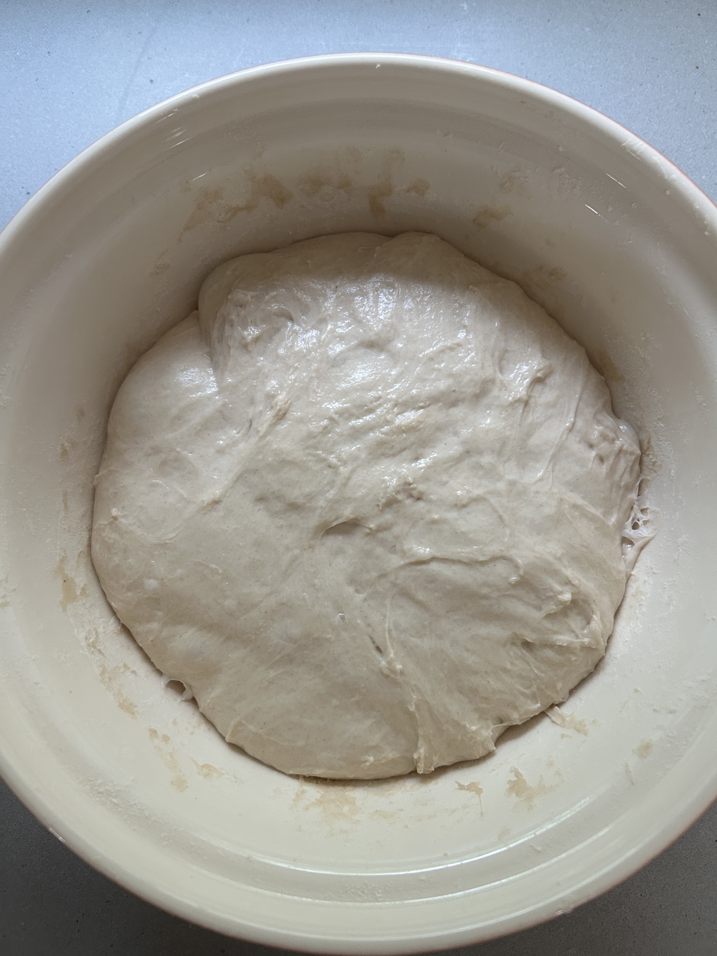 4. After last stretch/folds, during bulk ferment. Your dough will look a bit more formed and smooth after having done your stretch and folds. It will likely spread to fill the bowl like this: